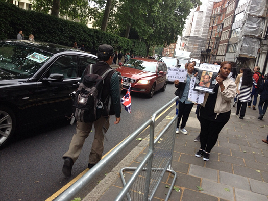 The Vigil had noticed that they were being closely monitored by someone who appeared to be an official from the High Commission, which is near Buckingham Palace. Suddenly a car flying the Swaziland flag emerged. Unfortunately for the High Commissioner it was stopped by traffic lights and the activists pounced, reducing the envoy to hiding her face behind a magazine.