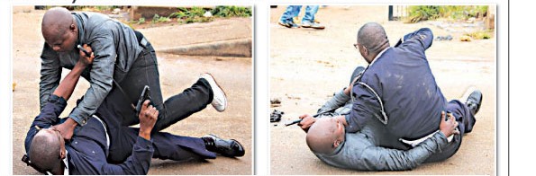 Photo: 3 (Courtesy: Swazi Observer) Manzini Police Station Commander - Raphael Maseko - floored by Maxwell Myeni and vice-versa during the clash between SNAT members and the police on Friday 24th August 2018. |