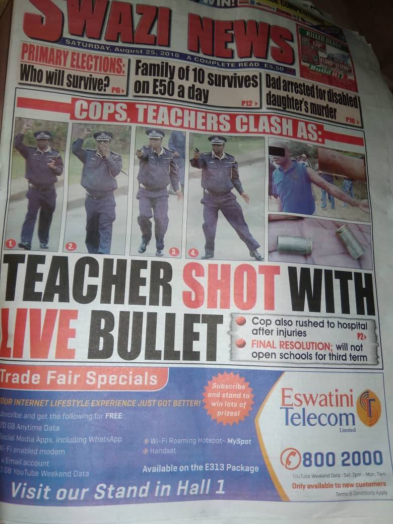 According to some of Swaziland National Association of Teachers (SNAT) eye witness members the story began on Friday morning when SNAT members who were holding a peaceful protest in Manzini as part of their Candlelight Vigil, when they were confronted by a few armed police officers. Reports by the Swazi Observer highlighted two main incidents that transpired as a result of the clash between a few police officers and the protesting teachers. One teacher (Willie Dlamini) was rushed to hospital after he incurred injuries in his arm from a police gunshot who used live ammunition on unarmed protesters, the report said. Swazi News headlined the story as shown in Photo 2 below.