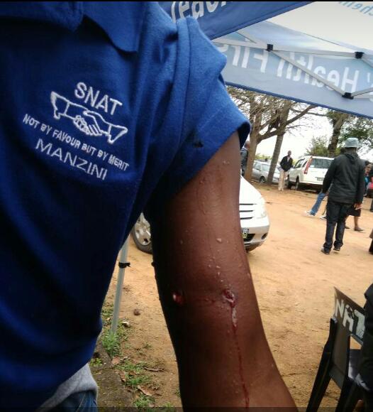 Photo 1: (Courtesy: SNAT Vigil Coordinator) Shows Willie 'MaWillies' Dlamini bleeding from a police gunshot wound in his arm on Friday morning 24th August 2018. |